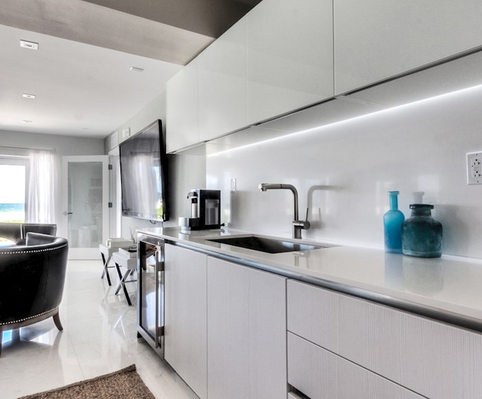 access and pools. Just 300 linear ft. of oceanfront, and beachfront vanishing-edge pool. Finished with the finest stone, wood, glass and wall coverings, exclusively selected for Sage Beach. Direct elevator access and private foyer leading to each residence and all residences offer panoramic ocean views. Floor-to-ceiling impact glass windows and sliders. Pre-wired for high tech security, advanced technology and TV customization. Chef island with custom-designed Italian cabinets,  Wolf gas cooktop and custom hood, Bosch concealed dishwasher, SubZero refrigerator/freezer, SubZero wine cellar.