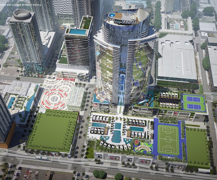 7TH floor amenities : Relaxation Areas : Conservatory, Relaxation Lounge, Outdoor Lounge with seating and gardens. Spa/Salon : Outdoor Bath Gardens, Steam Showers, Yoga Studio, Treatment Rooms, Hair/Nail Bar. Indoor Sports Center : State-of-the-art Fitness Center, Boxing Studio, Aerobics Area. Entertainment Center : Game Room, Kids Play Room, Recreation Lounge, Demo Kitchen, Jam Room with Recording Studio. Essentials : Food Market and Business Center. Upper deck : Resort Pool, Poolside Bungalows, Poolside Daybeds, Floating seating pods, Sunken Pods with firepits, Summer Kitchen with BBQ, Children’s Playground, Soccer Field, Tennis Courts, Indoor Basketball Court, Dog Park, Jogging Path. Skydeck & lounge : Lounge, Firepit, Sunrise Pool, Infinity Pool, Sundeck, Observatory, Tai Chi Deck.