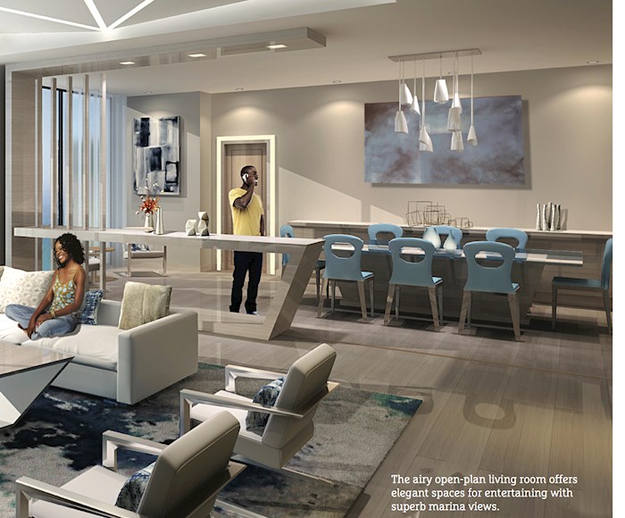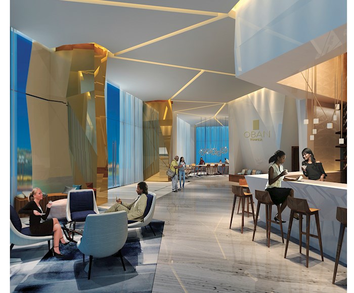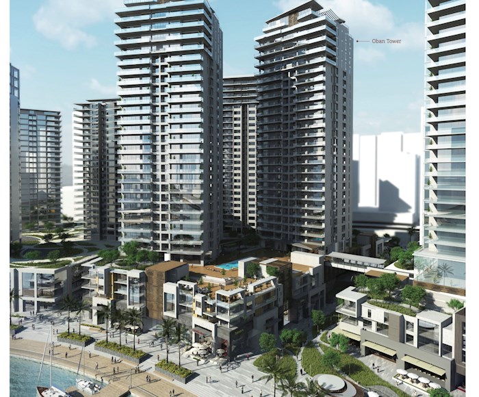 The residences : Oban Tower offers forty super-luxury four bedroom apartments; four elite six bedroom penthouses and one extraordinary seven bedroom villa. Each apartment is dedicated to luxury with only the finest quality materials being used. All are equipped with the latest high-end appliances which range from District Cooling air conditioning, to broadband (which is also provided throughout the entire city). The airy open-plan living room offers elegant spaces for entertaining with superb marina views. Stunning floor to ceiling windows enhance the impressive, relaxing, dining area. Natural stone and warm wood combine with the highest quality appliances, to create practical and beautiful kitchens. The airy, light-filled lobby will have a welcoming concierge to help homeowners at any time of day or night or guide visitors to apartments. Residents can enjoy the impressive private outdoor swimming pool or relax on the spacious terrace. Games rooms, offering a variety of sports, a screening room and delightful playground are all part of the abundant amenities. A contemporary sauna will soothe and relax.
