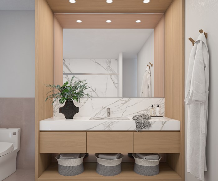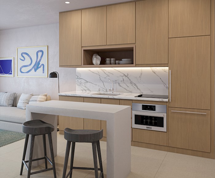 Fully finished and furnished Studio, 1- and 2-bedroom residences Furniture curated by AvroKO 9-foot-high ceilings with floor to ceiling glass windows Balcony with every residence Finished interior and exterior flooring Gourmet kitchens featuring custom Italian cabinetry Bosch appliances, including paneled refrigerator/freezer, dishwasher, built-in convection oven/microwave, and cooktop Rain showers in primary bathrooms and custom Italian vanities Full-size washer and dryer in unit Fully built-out closets Contemporary lighting packages, including recessed lighting, dimmers, and lighting control Brilliant smart-home system offering seamless personalization with the touch of a button, including ability to control audio, climate, window treatments, and lighting systems Smart keyless entry system allowing you to unlock your door via smart app, doorcode, keycard, or Apple Watch